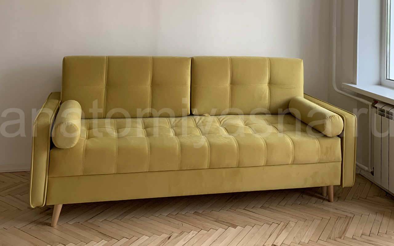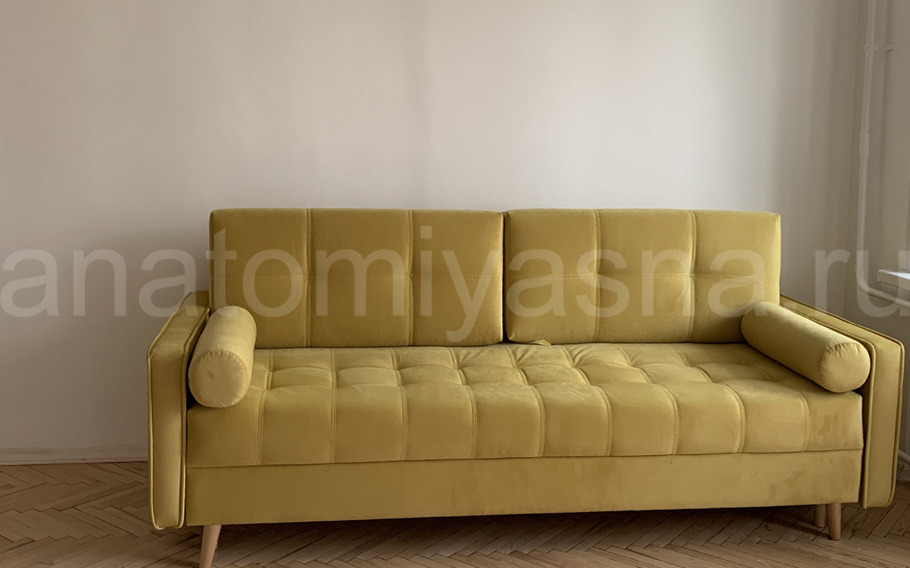 Заказали диван Белфаст. Доставили через 4 дня, аккуратно, быстро собрали. Диван стильный, расцветку выбрали желтый велюр. Комфортно сидеть, удачные подлокотники и дополнительные декоративные подушки.