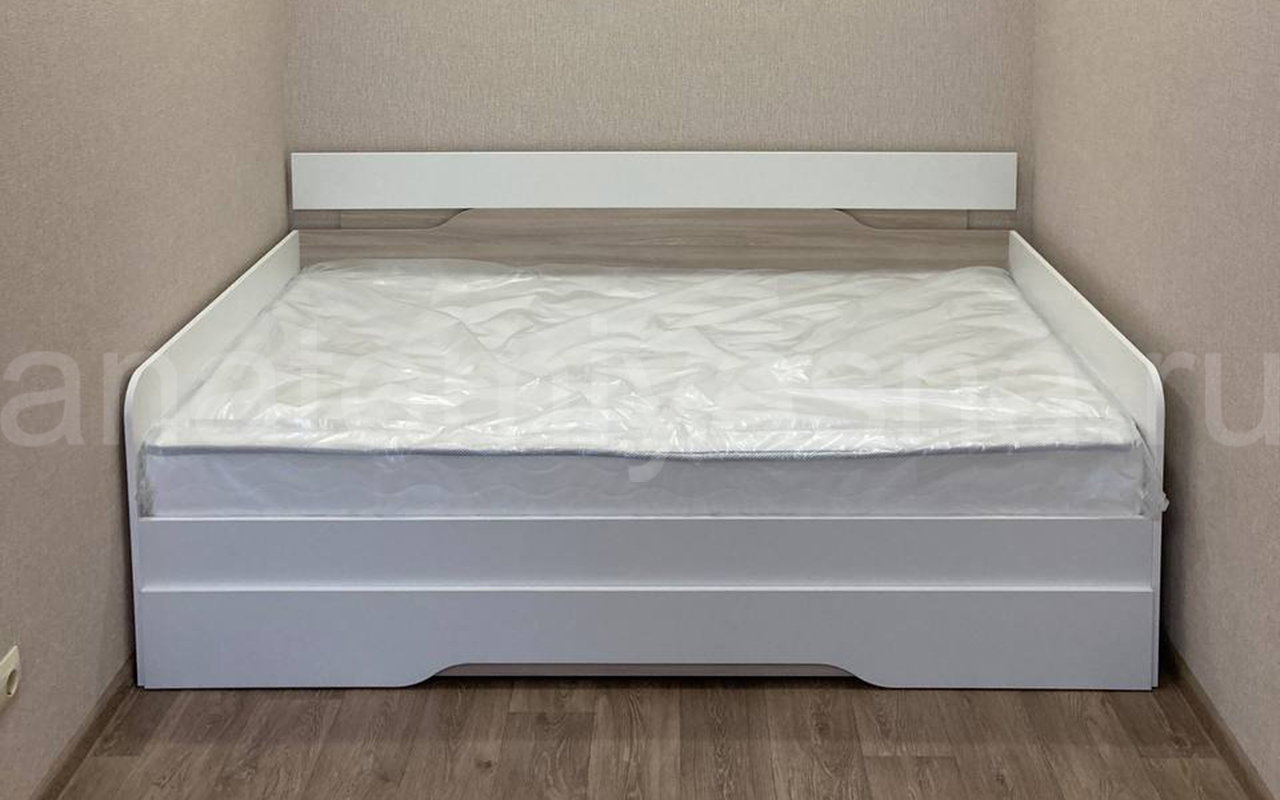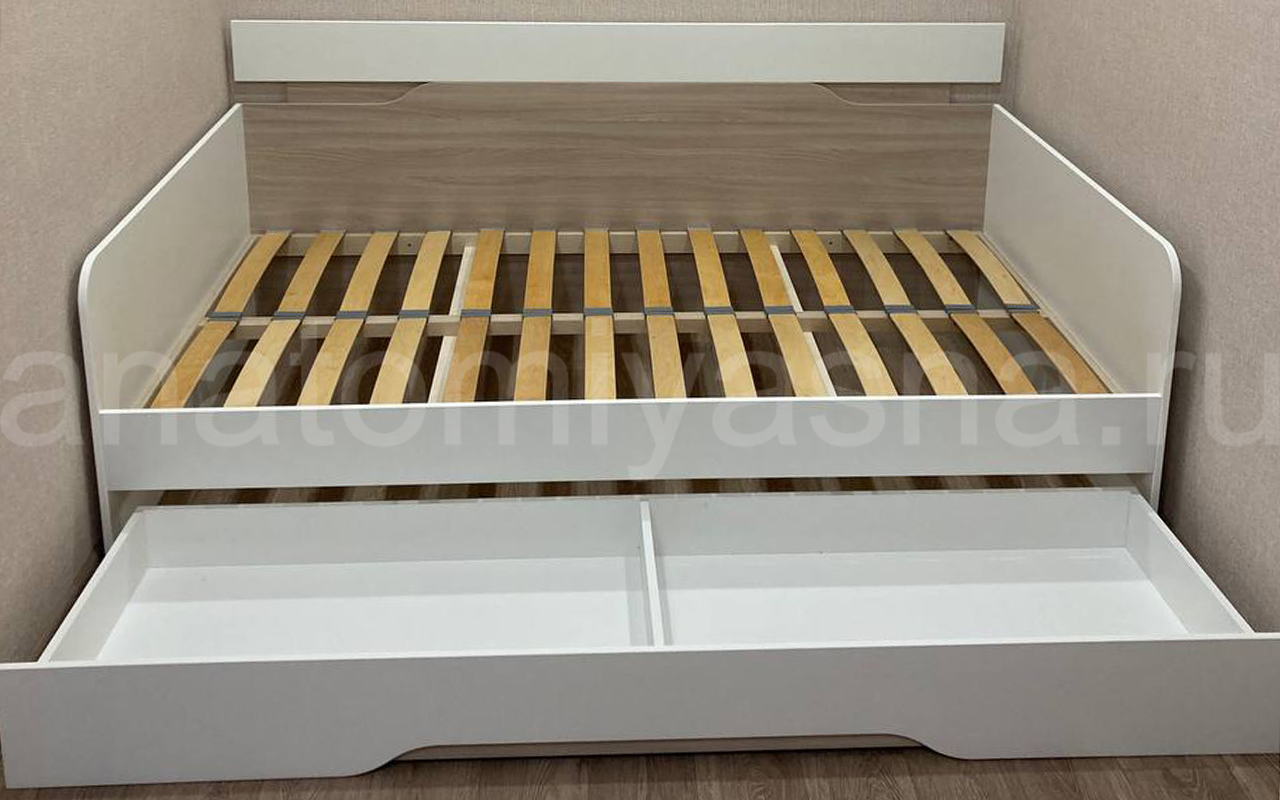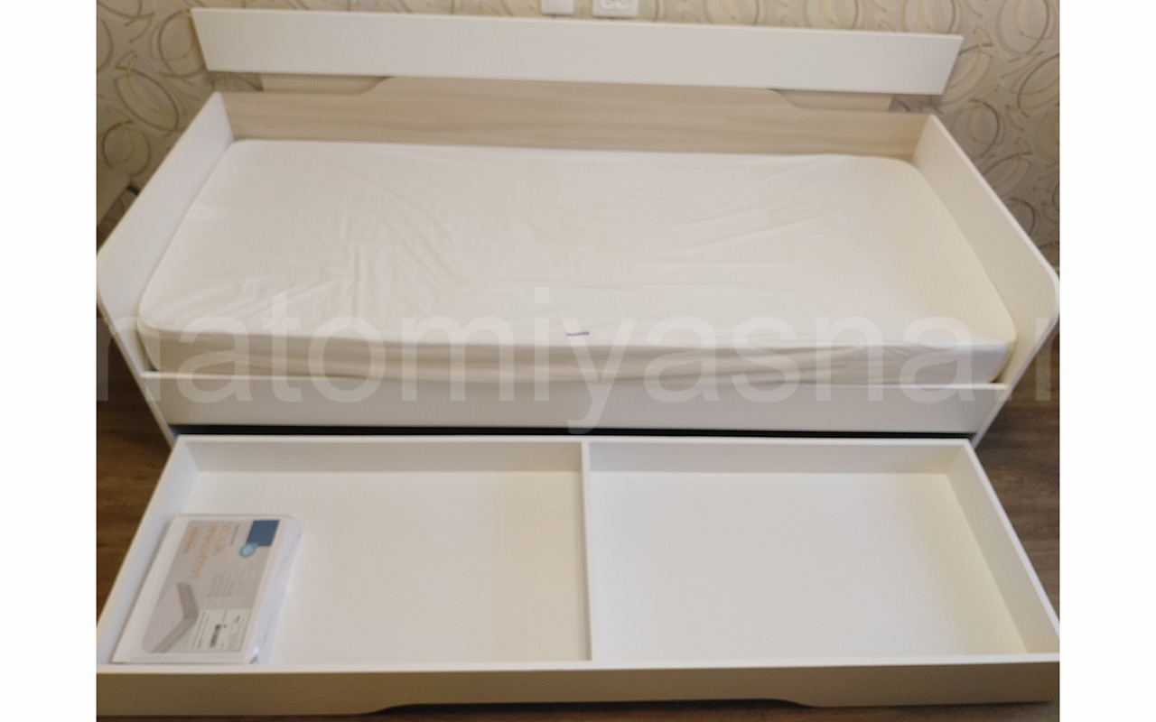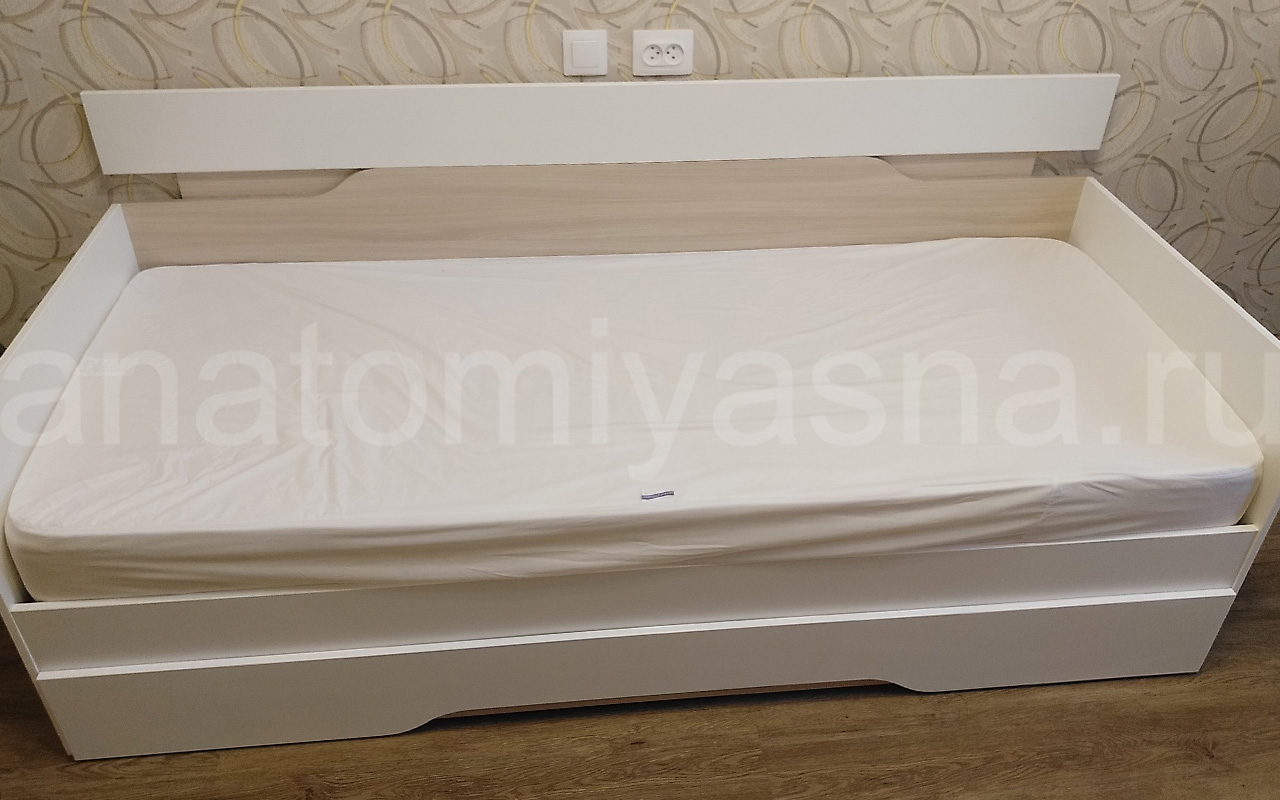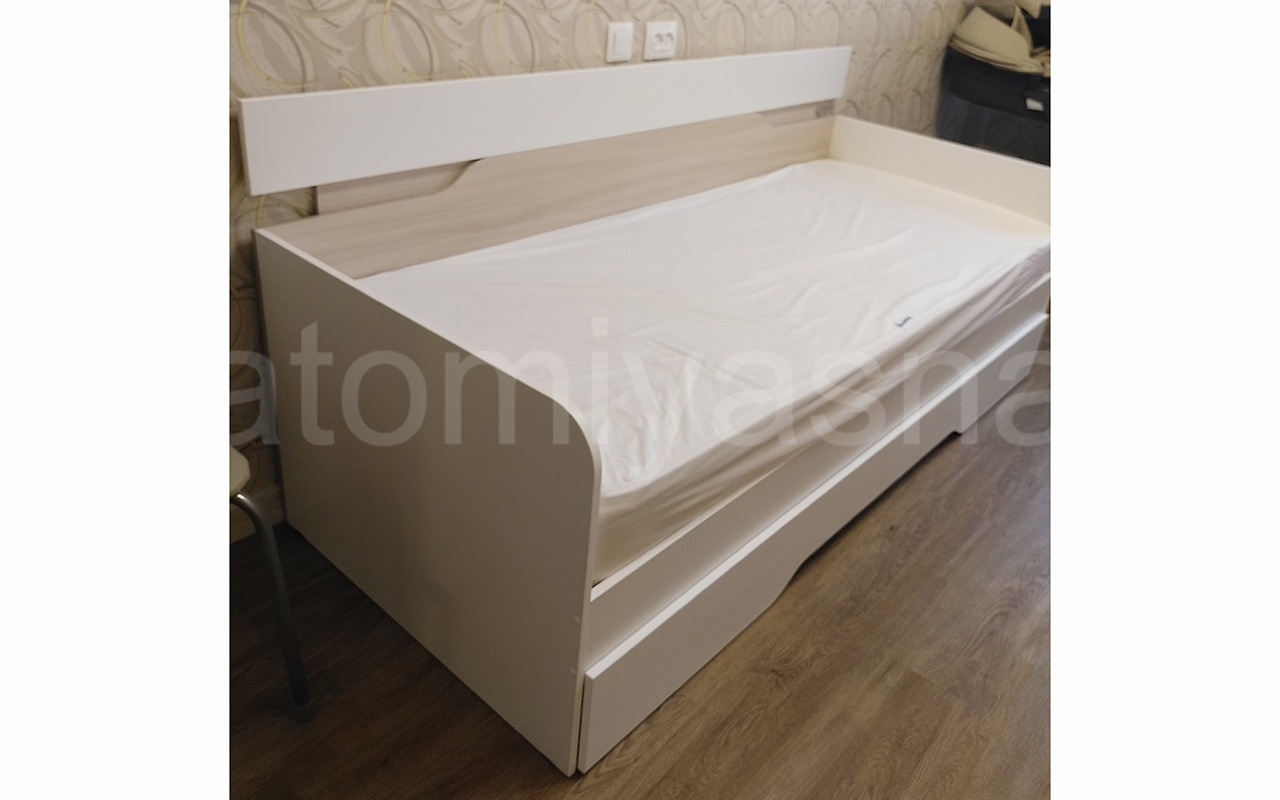 Кровать приобрели с выкатным ящиком, также заказали матрас Аскона Balance Status. Кровать по оттенку белая и ясень шимо светлый. По кровати нареканий нет, единственный момент с цветом выкатного ящика, но все обещали заменить. Матрас привезли через день. Он нас полностью устраивает. При покупке кровати с матрасом также действовала акция минус 5% на матрас. Что очень приятно. Рекомендую "Анатомию сна", также стоит обращаться к менеджерам на сайте, чтобы подсказали с комплектующими. Спасибо!