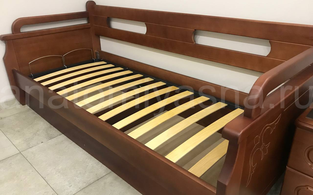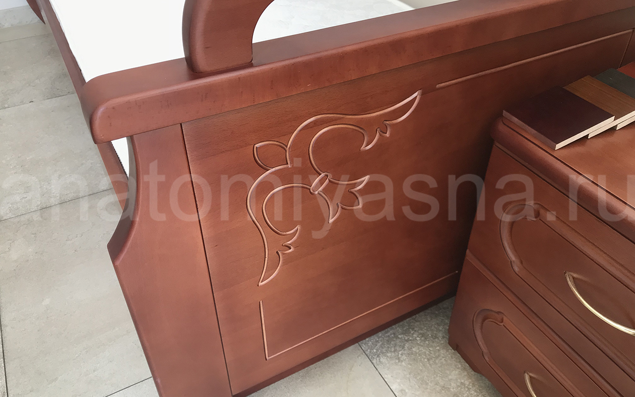 Приветствуем Вас в нашем интернет магазине «Анатомия сна». Хочу показать Вам кровать из массива DreamLine Тахта 2. Фабрика Дримлайн на рынке уже 14 лет. Производитель скрупулезно собирает и анализирует потребности покупателя для того чтобы полностью и своевременно удовлетворять Ваши ожидания. Производственная часть компании постоянно модернизируется и пополняется новейшими моделями профессиональной аппаратуры и станками от ведущих мировых производителей, для того, чтобы клиенты всегда получали товары наивысшего качества. Каркас кровати DreamLine Тахта 2 изготавливается из 100 % древесины. На выбор есть 2 варианта исполнения: из массива бука и массива ясеня. Кровати из массива обладают рядом серьезных преимуществ: высокая прочность, долгий срок службы, экологичность, не содержит в себе токсичных веществ. Кровати при необходимости можно реставрировать. Массив хорошо переносит многократные сборки и переезды, транспортировки. Массив отличает приятные ощущения, что обусловлено низкой теплопроводностью материала. Благодаря этому, прикасаясь к дереву, оно кажется нам теплым. Также кровати из массива -это всегда эксклюзивные изделия благодаря тому, что каждое дерево имеет свой уникальный, неповторимый рисунок. Бук и ясень относится к дереву ценных пород, при этом имеют некоторые отличия. Бук известен благодаря свой прочности, высокой плотности, богатой текстуре и хорошей обрабатываемости. Изделие способно выдерживать очень высокие механические нагрузки. Древесина имеет особый рисунок с узкими блестящими сердцевидными линиями. Бук отличается высокой гигроскопичностью, однако при обработке лаком изделия из бука надежно защищены от повышенной влажности. Ясень-упругая и плотная древесина, отличительной особенностью которой является богатый текстурный рисунок поверхности. По своим физико-химическим свойствам и эксплуатационным характеристикам ясень не уступает древесине дуба. Плотность древесины ясеня выше, чем плотность бука, что делает ее особенно прочной к механическим воздействиям. Лакокрасочные покрытия усиливают данное свойство, делает мебель из ясеня практически вечной. Гигроскопичность ясеня меньше, чем у бука, благодаря этому ясень можно использовать в очень влажных помещениях. Есть достаточно большое количество цветовых решений по ясеню и буку. Данная кровать представлена в массиве бука, цвет старая вишня. Кровать укомплектована основанием с подъемным механизмом и бельевым ящиком. Ящик можно изготовить на выбор: в ЛДСП, буке, ясеня. Использование основания с подъемным механизмом позволяет организовать дополнительное место для хранения вещей. Также кровать можно укомплектовать ортопедическим основанием на ножках или основанием Active best с узкими ламелями на ножках. При использовании оснований такого типа ортопедические свойства матраса усиливаются. Получается амортизация и циркуляция воздуха. Спальное место будет оставаться свежим и чистым. По умолчанию кровать идет в комплектации со встроенным основанием с прямыми ламелями. В комплектации с прямыми ламелями у кровати не будет короба. Также из дополнительных опций кровать можно комплектовать с выкатными ящиками. Высота изголовья кровати 85 см. Высота царг кровати 75 см. Кровать выполнена в классическом стиле, благодаря этому она хорошо впишется в любой инте